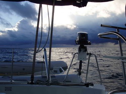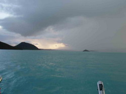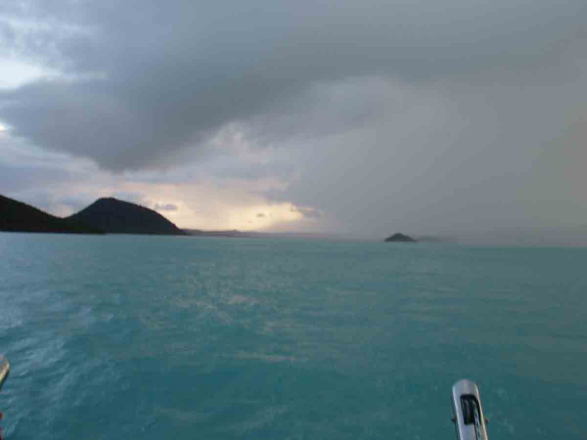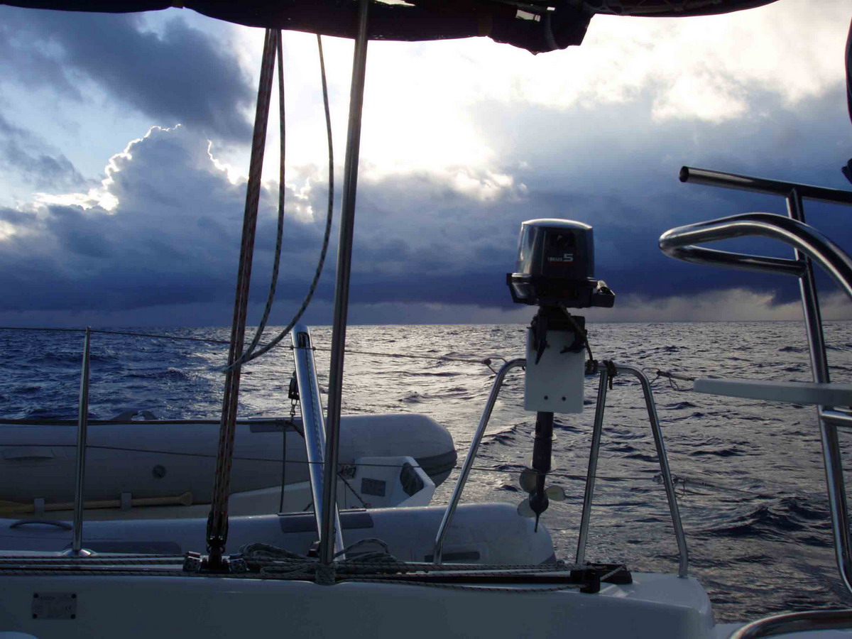 Dummerweise liegt unser Ziel genau im Wind und dann gleich 50 Meilen voraus. So ein Wohnmobil hat ja auch seine Vorteile - der Mann am Rohr- wettergeschützt - beobachtet den Autopilot und der Rest sitzt in der guten Stube, liest, ißt Äpfel oder versucht auszurechnen, in welcher Woche „ die schönsten Strände der Welt“ erreicht werden können. Rasmus haben wir vergessen - ich gestehe es - und den Merlot allein genossen! Jetzt gibt‘s was auf die Mütze. Schwarze Regenwalzen verdunkeln voraus den Himmel, wir reffen die Segel, die nur stützen und dampfern unter Maschine gegenan. Es brist auf , 30 Knoten zeigt unser Windmesser - wenn wir so weiter kreuzen, können wir Ostereier suchen auf Antigua. Kursänderung nach Montserrat - empfehlen ja sowieso alle! Direkt nach Antigua ist zum Kotzen - und das meinen die Herren Doyle und Co wörtlich. Selbst nach Redonda müssen wir jetzt kreuzen. Die beiden Rümpfe krachen in die Wellen. Das Schiff ächzt und knackt zum Fürchten - immer wieder. Oben auf dem Bock sitzt man hoch und relativ trocken, während unten im Salon mit seinen Panoramascheiben die Scheibenwischer fehlen. Die zweite Regenwalze hat uns kräftig geduscht und geschüttelt, es wird heller und...