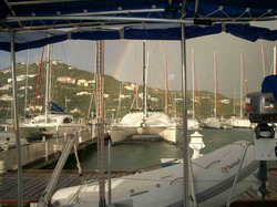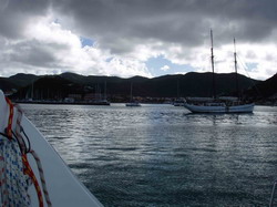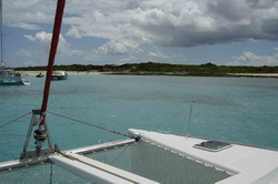Antigua ist so schön bei unseren Experten beschrieben, daß ich empfehle, sich es gemütlich im Cockpit zu machen, ein Glas Was-auch-immer in der Hand, und nachzulesen. Die Realität verdirbt einem nur die Erinnerung- außerdem regnet es garantiert, ist teuer und die wahren Highlights, die unser Hotelexperte Hörmann immer in der WAMS anpreist, lassen Yachties sowieso nicht rein. Der Morgen auf dem Weg „ zu den schönsten Stränden der Welt“ beginnt mit einem Regenbogen - in 6 Jahrzehnten habe ich nicht so viele Regenbogen gesehen, wie hier in 10 Tagen - und natürlich dem notwendigen Regen. Dafür müssen wir nicht ausklarieren und können bei Hellwerden los. Ist ja auch kein Problem. Selbst wenn die zweite Flasche Merlot leer ist, ist Zuhause erst die Tagesschau vorbei und wir gehen einsam in die Koje- da ist man erleichtert, wenn man bei Hellwerden ins frische Wasser darf. Auch Rasmus hat seinen Ruhetag genutzt und bläst zu unsrer Freude wieder stramm aus Ost. Aus der Abdeckung Richtung Barbuda segeln wir halben Winds nach Norden- manchmal mit zuviel Tuch -endlich ( 2. Segeltag) mal wieder. „Die Versorgungsmöglichkeiten mit Lebensmitteln und Wasser sowie die Transportmöglichkeiten auf der Insel sind gleich Null“ berichtet unser geschätzter Bartholmes, aber auch „der schönste Ankerplatz der Gewässer von Antigua und Barbuda“. Ist doch klar, dass TRES AMIGOS mit seinen fünf amigos hin muss! In der Vorfreude planen wir sogar auf dem Weg dahin, einen Badetag einzulegen. Und dann nähern wir uns nach 40 Meilen Palmetto Point, der Südwestecke von Barbuda. Ein Problem! Wir müssen ausklarieren - entweder heute oder morgen. Man soll das Dinghi über den Strand in die Lagune tragen können und nach Coddrington fahren, um dort die Immigration zu kontakten. Wir ankern auf Sand - mutterseelenallein ( verspricht ja auch Bartholmes) - „vor dem schönsten Ankerplatz der Welt“? Was sehen wir: hellgrünes Wasser, einen lupenreinen Sandstrand, an dem sich die Dünung mit einer ordentlichen Welle voll Getöse bricht, dahinter Gestrüpp, welches die flache Insel verbirgt. Nur der Funkmast läßt Zivilisation vermuten. Die Lagune entpuppt sich als zugewachsener, verkrauteter Tümpel - keine Chance für das Dinghi. Kein Restaurant weit und breit - das Hotel Dunes an der Südwestspitze ist leer und verlassen. Und hier sollen wir bleiben? Selber kochen? Keinen frischen Fisch? Keine Pinacolada - nicht mal aus dem Plastikbecher? Nein, nein, nein! Es wird ausklariert - und zwar sofort. Eile tut Not, denn der verläßliche Doyle meldet, die Behörden arbeiten nur bis 16 Uhr. Um es kurz zu machen, trotz der Brandung und Strom, gelingt die Anlandung, das Einholen der Trophäe in den Paß, sogar der Kauf von Eiern, Schokolade und schwarzem Tee( hier sei Bartholmes widersprochen). Das Taxi über 16 gerufen zum Hotel Dunes kommt nicht und an Land kann ich nicht nachhaken (UKW-Zweitgerät empfiehlt sich). Ein langer Fußmarsch und glückliche Umstände, bringen mich zurück zum Ankerlieger und nach einem abenteuerlichen Entermanöver ins Schlauchboot bei voller Fahrt bin ich mit nassem Hintern und trockenen Pässen wieder auf dem fluchtbereiten Wohnmobil.