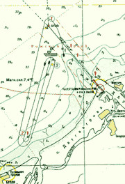 Spitze – unangefochten bis zum Ziel. Den wilden Finnen folgt der rote Selbstbau FLYVER`N – ebenfalls aus Helsinki - und prescht um die Ansteuerungstonne. ( Er verliert später in der ruppigen See und dem böigen Wind den Mast, lehnt Hilfe ab und erhält abends den Sonderpreis verdient für exzellente Seemannschaft.) Dahinter gleich die WILDEN PFERDE, ein F 9R aus Berlin. Mit unserem F 31 R und einem Reff jagen wir hinterher, verfolgt von JOLLY ROGER, einem F 27, der sich auf Grund seiner günstigeren Vermessung auf den dritten Platz vor uns setzt. |