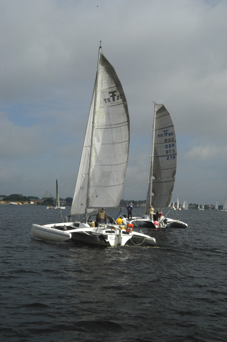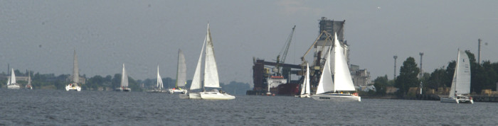Die Parade der 45 angereisten Mehrrümpfer zum Internationalen Multihulltreffen 2005 in Riga, der lebendigen Hauptstadt von Lettland auf dem Fluss Daugawa gleich vor dem Stadthafen Andrejosta fällt bescheiden aus. Nur achtzehn Teilnehmer hissen nördlich der Brücke am Rande der malerischen Altstadt die Segel und laufen vor dem Wind den Fluss hinab zur Mündung in die Bucht. Mit dem Fluss und dem Wind im Rücken ziehen die 11 Katamarane und